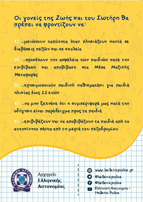 Στους μαθητές δόθηκαν φυλλάδια με συμβουλές, προκειμένου να μετακινούνται με ασφάλεια από και προς το σχολείο τους, ενώ οι γονείς ενημερώθηκαν σχετικά με την κυκλοφοριακή αγωγή και τους βασικούς κανόνες του Κώδικα Οδικής Κυκλοφορίας.