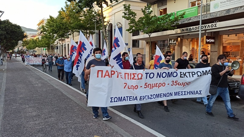 Μαχητική απάντηση έδωσαν προχθές τα Σωματεία Εργαζομένων Οικοδόμων, Τροφίμων, ΔΕΥΑ, Επισιτισμού-Τουρισμού, Ιδιωτικών Υπαλλήλων Μεσσηνίας και άλλοι φορείς στο «αντεργατικό νομοσχέδιο» που φέρνει τις επόμενες μέρες στη Βουλή η κυβέρνηση. Τα σωματεία έδωσαν αγωνιστικό ραντεβού την Πέμπτη 10 Ιούνη, μέρα πανελλαδικής πανεργατικής απεργίας, στις 10.00 το πρωί, στην πλατεία 23ης Μαρτίου.