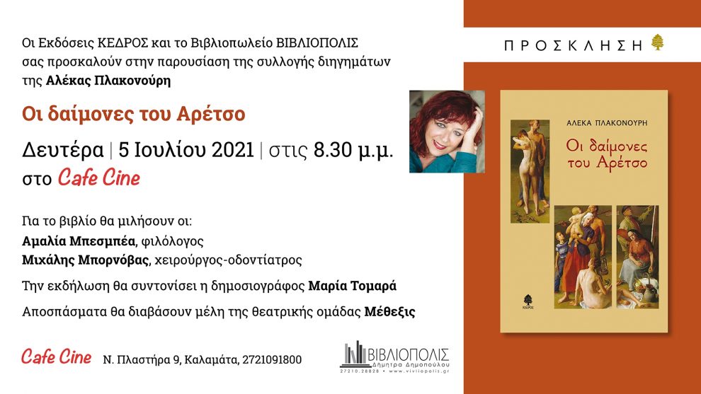 Παρουσίαση της συλλογής διηγημάτων της Αλέκας Πλακονούρη «Οι δαίμονες του Αρέτσο» θα γίνει από τις εκδόσεις Κέδρος και το βιβλιοπωλείο Βιβλιόπολις