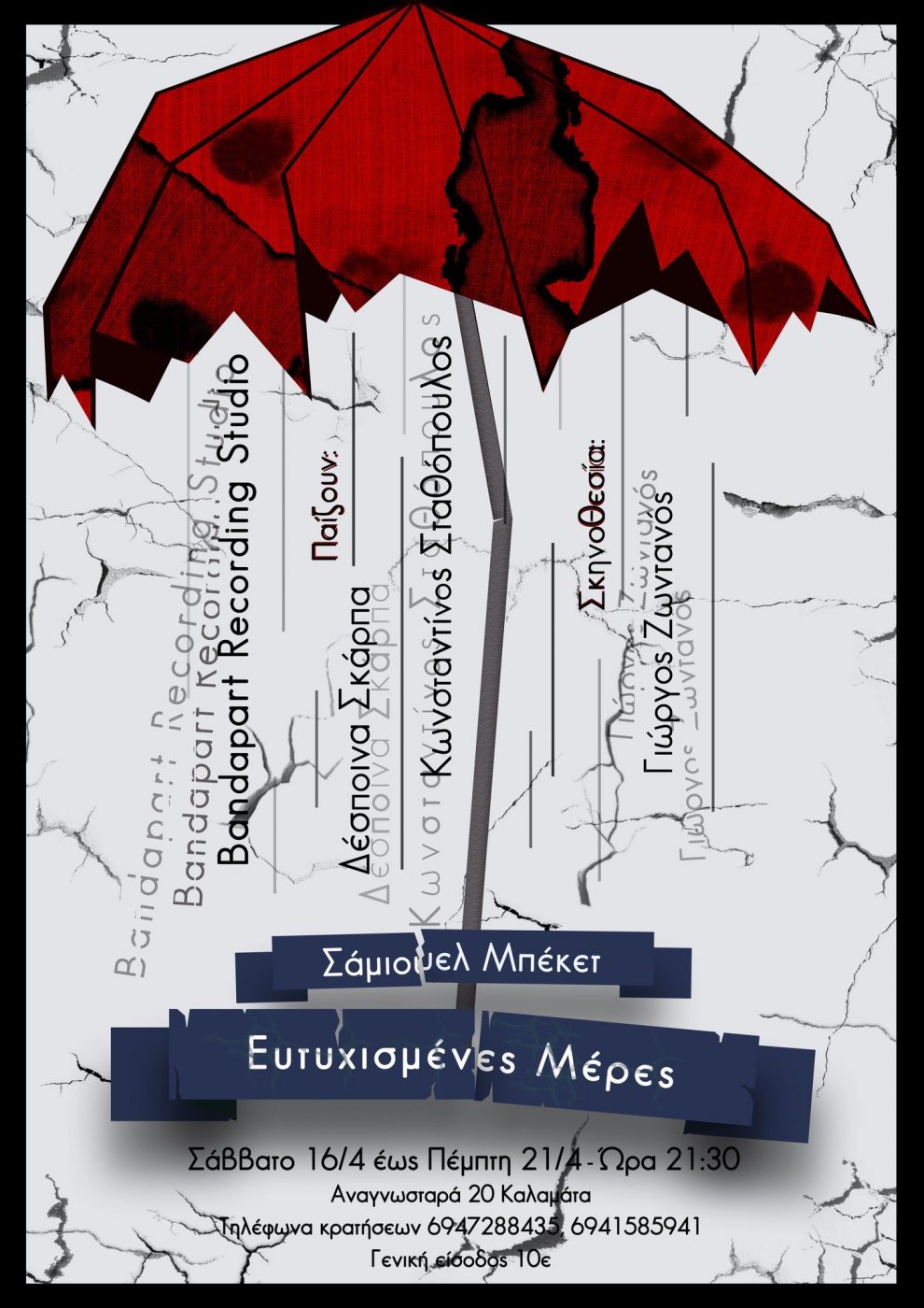 Το θεατρικό έργο του Σάμιουελ Μπέκετ ”Ευτυχισμένες Μέρες” σε σκηνοθεσία Γιώργου Ζωντανού παρουσιάζεται καθημερινά από το Σάββατο 16/4 έως την Πέμπτη 21/4 στις 9:30 το βράδυ στο Bandapart Recording Studio Αναγνωσταρά 20, Καλαμάτα.