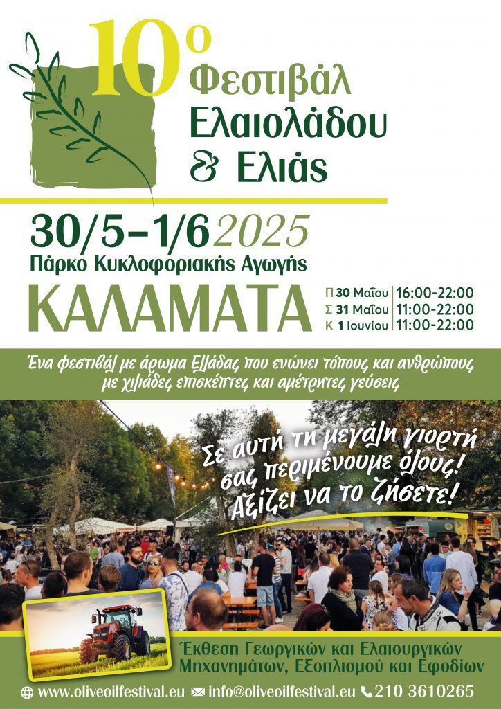 Η μεγαλύτερη έκθεση στη Μεσόγειο για το Ελαιόλαδο & την Επιτραπέζια Ελιά καθώς και η Έκθεση Γεωργικών Μηχανημάτων διοργανώνεται για δέκατη φορά στις 30, 31 Μαΐου και 1 Ιουνίου 2025 στο Πάρκο Κυκλοφοριακής Αγωγής στην Καλαμάτα και τελεί υπό την Αιγίδα του Υπουργείου Αγροτικής Ανάπτυξης και Τροφίμων, της Περιφέρειας Πελοποννήσου, του Δήμου Καλαμάτας και του Επιμελητηρίου Μεσσηνίας.