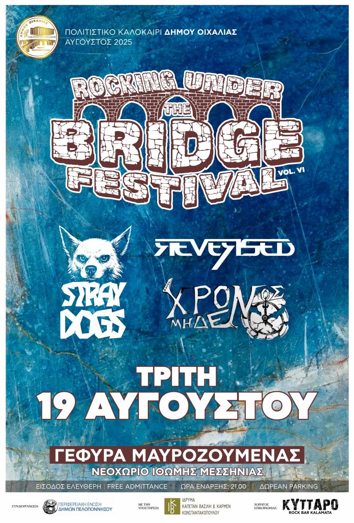 Για 6η φορά ο Δήμος Οιχαλίας διεξάγει, την καθιερωμένη πια, μουσική εκδήλωση “Rocking under the bridge”, στην αρχαία γέφυρα της Μαυροζούμενας στο Νεοχώριο Ιθώμης σήμερα Τρίτη, 19 Αυγούστου, στις 9.00 το βράδυ, με ελεύθερη είσοδο.