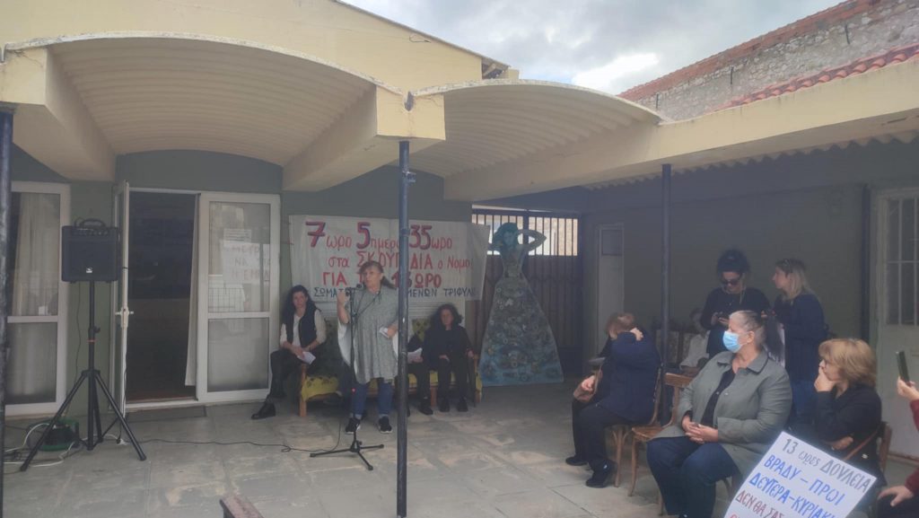 Αγωνιστικούς χαιρετισμούς απηύθυναν: Από την Ομάδα Γυναικών Τριφυλίας η γραμματέας του Δ.Σ. Σωτηρία Σταθοπούλου, από το Σωματείο Υπαλλήλων Περιφερειακής Ενότητας Μεσσηνίας η πρόεδρος του Δ.Σ. Ελένη Τομπουλίδου και από το Σωματείο Υπαλλήλων στον Ιδιωτικό Τομέα Ν. Μεσσηνίας η Ειρήνη Κουκούμη.