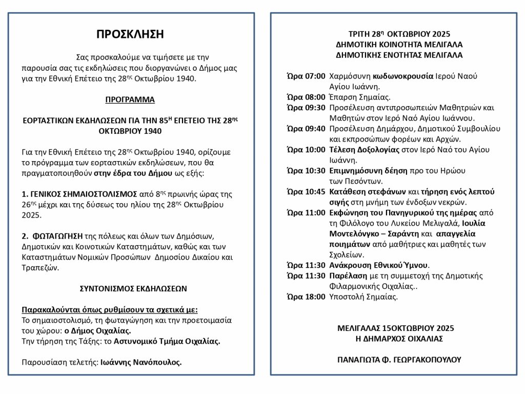 Το πρόγραμμα των εορταστικών εκδηλώσεων για την 85η επέτειο της 28ης Οκτωβρίου 1940 ανακοίνωσε ο Δήμος Οιχαλίας, που θα τιμηθεί σε Μελιγαλά, Μερόπη, Δώριο και Διαβολίτσι.