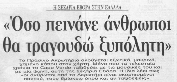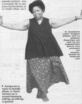 »Στην ερμηνεία της μένει αξεπέραστα ζεστή, ανθρώπινη κι αληθινή, όπως στα πρώτα της τραγούδια. Με τη διαφορά ότι η “ξυπόλητη ντίβα” μας έχει κοντά της την αναγνώριση του κόσμου, των θεωρητικών της μουσικής, των σταρ (και της Μαντόνα της ίδιας, εξάλλου) και των μεγάλων ακροατηρίων από τη Νέα Υόρκη και το Παρίσι, και τον Λυκαβηττό αύριο βράδυ. Η Σεζάρια Εβόρα δεν χάνει την ευκαιρία να δηλώσει πως“όσο υπάρχουν άνθρωποι που πεινάνε, θα τραγουδώ ξυπόλητη”!»