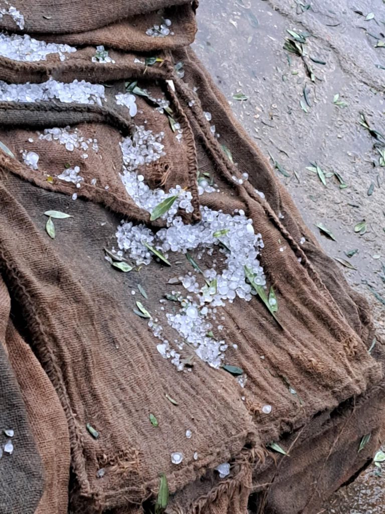 Στη δε φωτογραφία απεικονίζεται χαλάζι πάνω σε άδεια τσουβάλια από λιομάζωμα στην περιοχή.