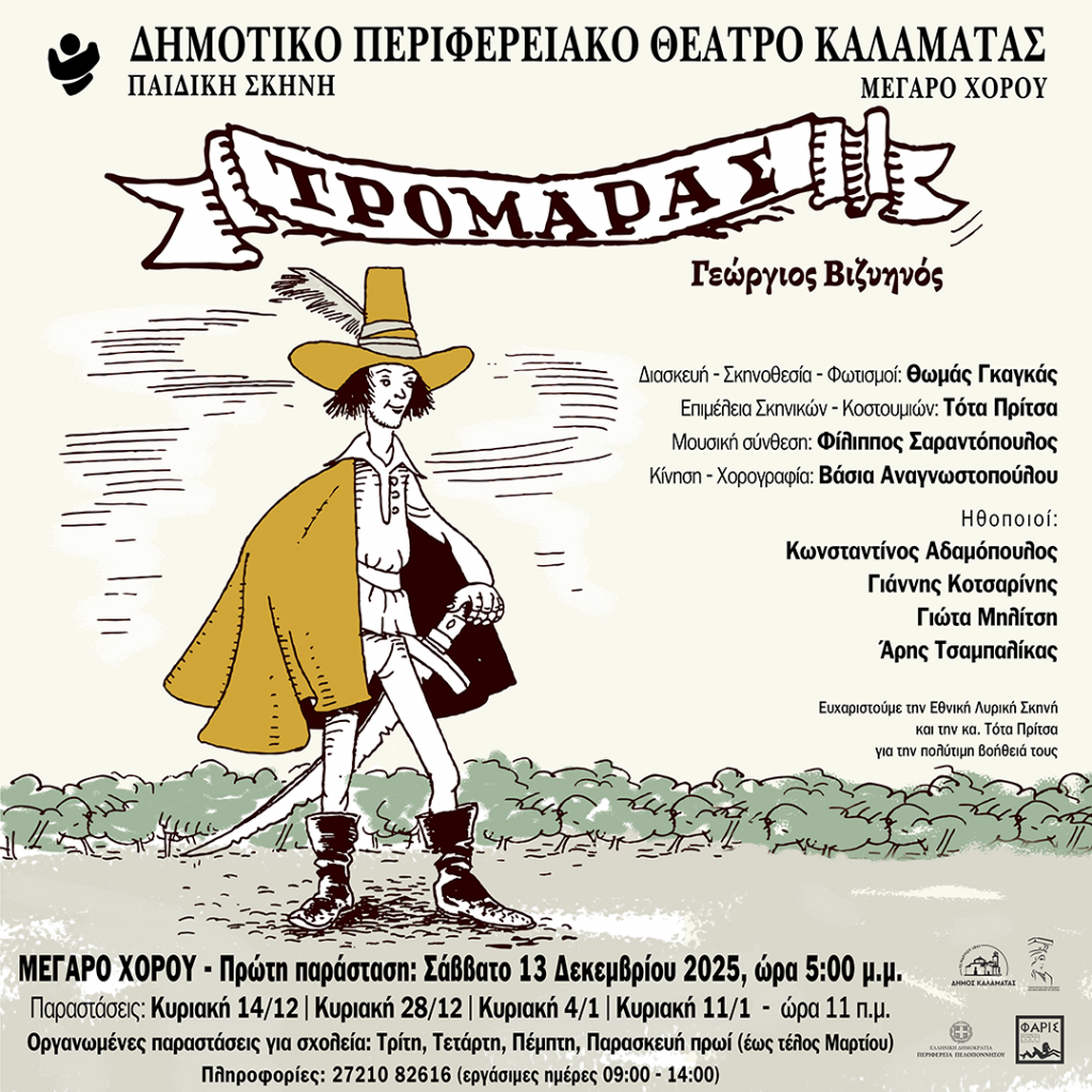 Η Παιδική Σκηνή του Δημοτικού Περιφερειακού Θεάτρου Καλαμάτας επιστρέφει φέτος με μια παράσταση που κοιτά κατάματα την παιδική ψυχή, φωτίζοντας τις πιο κρυφές της φοβίες και τις πιο αυθεντικές της δυνάμεις. Για τη χειμερινή περίοδο 2025-2026 ανεβάζει τον «Τρομάρα» του Γιώργου Βιζυηνού, ένα κείμενο σταθμό, γραμμένο το 1884 και συχνά χαρακτηρισμένο ως το πρώτο διήγημα για παιδιά στη νεοελληνική λογοτεχνία.