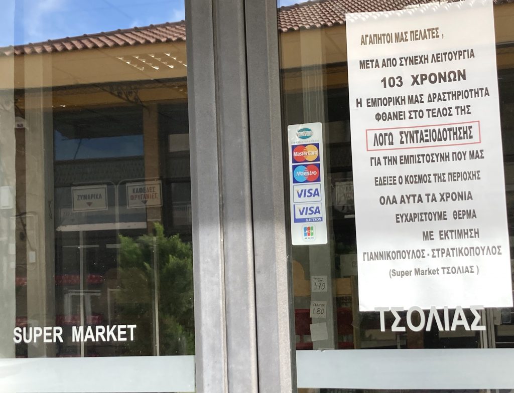 Ο ιστορικός κύκλος της εμπορικής δραστηριότητας της επιχείρησης έκλεισε. Συγκινητική η ανακοίνωση της επιχείρησης στην είσοδο του καταστήματος: «Αγαπητοί μας πελάτες, μετά συνεχή λειτουργία 103 χρόνων η εμπορική μας δραστηριότητα φθάνει στο τέλος της λόγω συνταξιοδότησης. Για την εμπιστοσύνη που μας έδειξε ο κόσμος της περιοχής όλα αυτά τα χρόνια ευχαριστούμε θερμά. Με εκτίμηση Γιαννικόπουλος – Στρατικόπουλος (Super Market ΤΣΟΛΙΑΣ)».