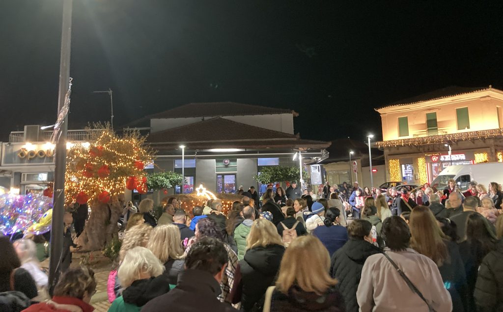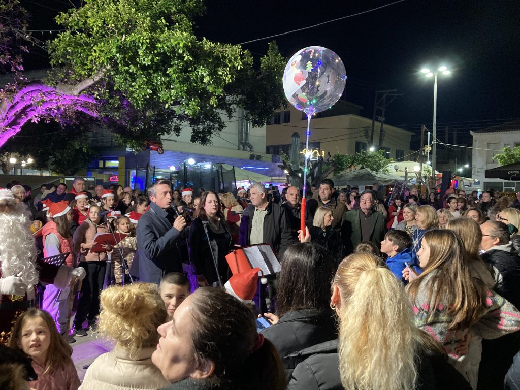 Στη συνέχεια φωταγωγήθηκε η μεταλλική κατασκευή χριστουγεννιάτικου δέντρου στην κεντρική πλατεία, όπως και ο εορταστικός διάκοσμος.