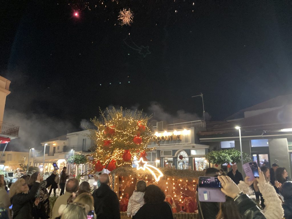 Το χορωδιακό σύνολο της Φιλαρμονικής Κυπαρισσίας «Οι Κανταδόροι» έψαλαν κάλαντα και ερμήνευσαν τραγούδια, ενώ έπειτα από την αντίστροφη μέτρηση και τη φωταγώγηση του δέντρου και της φάτνης ο ουρανός γέμισε χρώματα από πυροτεχνήματα.