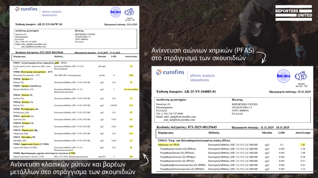 Η ανάλυση του δείγματος αποκαλύπτει «κλασικούς ρύπους», υψηλές συγκεντρώσεις βαρέων μετάλλων «πολύ πάνω από τα όρια για το πόσιμο νερό», καθώς και PFAS, τα αποκαλούμενα «αιώνια χημικά», σε τιμή 7.650 ng/l – επίπεδο 76 φορές πάνω από το κατώφλι που χαρακτηρίζει μια περιοχή ως περιβαλλοντικό hotspot.