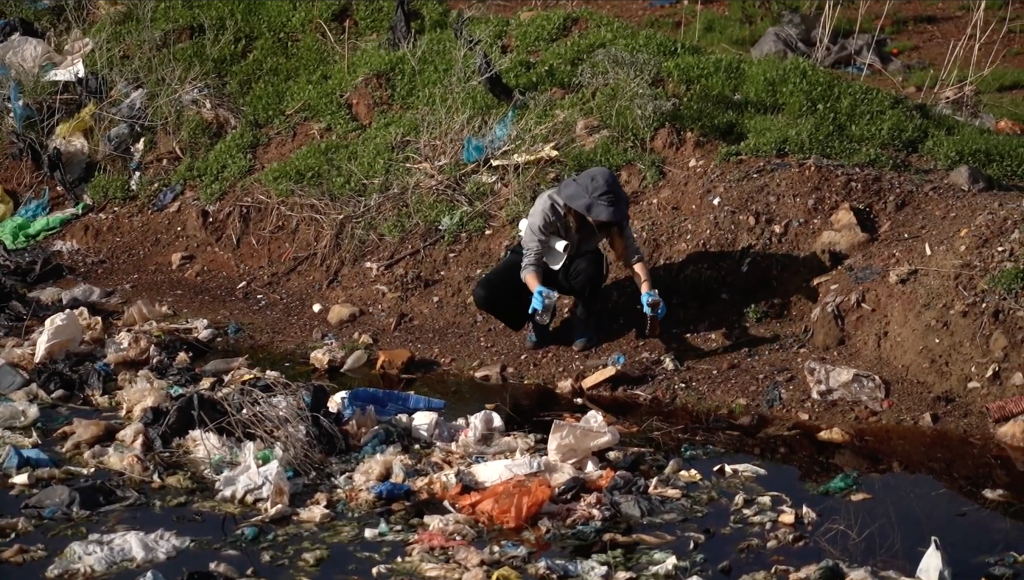 Δειγματοληψία στραγγίσματος στην τάφρο της Μαραθόλακκας. Πέρα από το στράγγισμα που λιμνάζει δίπλα στον όγκο των σκουπιδιών υπάρχει και αυτό που διαφεύγει μέσα από το χώμα. Φωτογραφία: Νίκος Παλαιολόγος