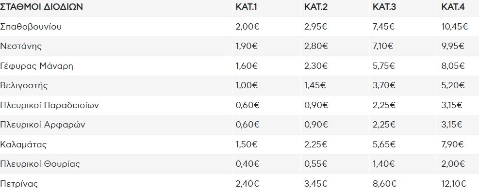 Κόρινθος – Καλαμάτα: από 11,30 ευρώ το 2025, στα 11,75 ευρώ από 1/1/2026. Κόρινθος – Σπάρτη: από 11,05 ευρώ σε 11,50 ευρώ.