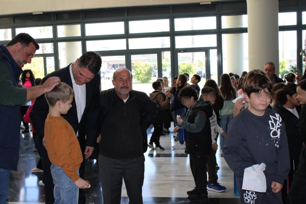 Οι μαθητές όλων των τάξεων συνοδευόμενοι από τους δασκάλους τους συγκεντρώθηκαν στο ισόγειο του Δημαρχείου και με τα τραγούδια και τις παιδικές φωνές τους γέμισαν τον χώρο με γιορτινή διάθεση.