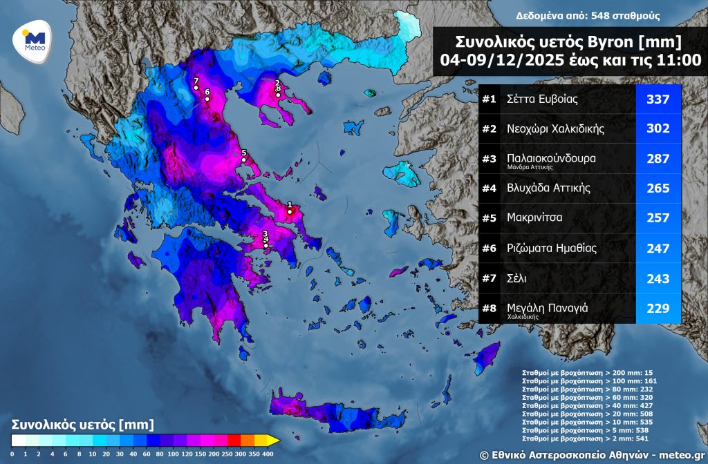 Από τα τρία επεισόδια, ο Byron (4–7 Δεκεμβρίου) είχε τη μεγαλύτερη έκταση και ένταση, επηρεάζοντας 14 νομούς και προκαλώντας σοβαρά πλημμυρικά φαινόμενα σε Aττική, Λακωνία, Μεσσηνία, Εύβοια, Κρήτη, Θεσσαλία, Μαγνησία και Δωδεκάνησα. Στη Λάρισα εκδόθηκε μήνυμα 112 για προληπτική απομάκρυνση κατοίκων λόγω ανόδου της στάθμης του Ενιπέα, ενώ σε πολλές περιοχές καταγράφηκαν παρασύρσεις οχημάτων, εκτεταμένες ζημιές στο οδικό δίκτυο και σημαντικές επιπτώσεις σε κατοικίες και επιχειρήσεις.