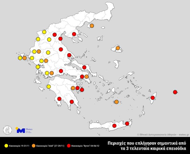 O χάρτης που ακολουθεί παρουσιάζει την κατανομή των περιοχών στις οποίες σημειώθηκαν τα σημαντικότερα καιρικά επεισόδια κατά τη διάρκεια των τριών κακοκαιριών.