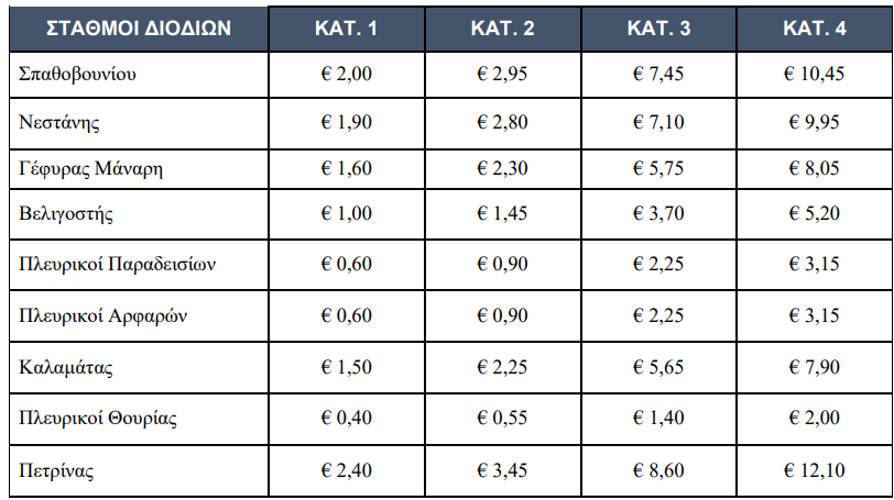 Σημειώνεται ότι οι νέες χρεώσεις διαφοροποιούνται ανά σταθμό και κατηγορία οχήματος, επιβεβαιώνοντας ότι το συνολικό κόστος διέλευσης συνεχίζει την ανοδική του πορεία.