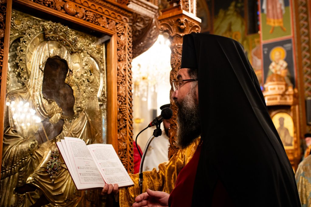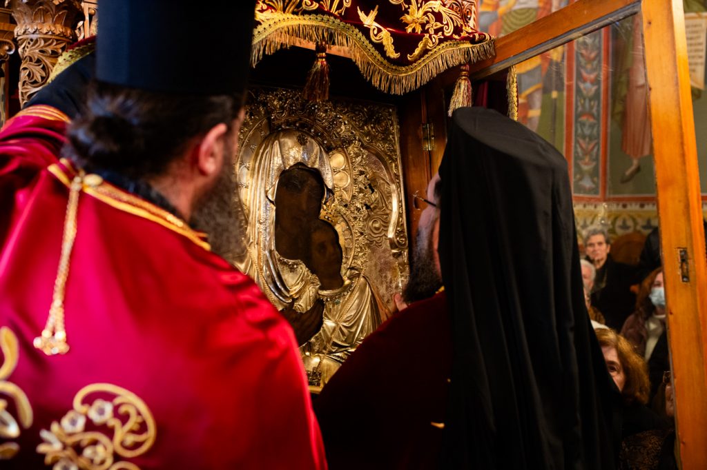 Στη συνέχεια, πραγματοποιήθηκε η ενθρόνιση της Θαυματουργού Εικόνος από το μόνιμο θρόνο της, στο θρόνο λιτανεύσεως Αυτής.