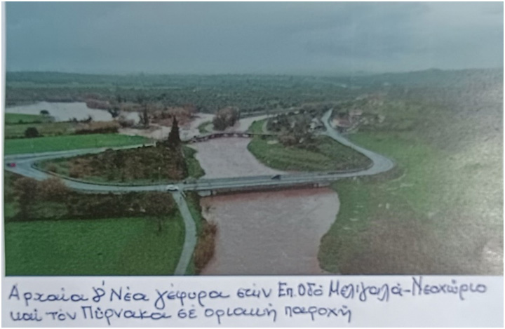α) Σοβαρό έργο στη συμβολή του με τον κύριο παραχείμαρρο του Πύρνακα ανάντη της αρχαίας γέφυρας.