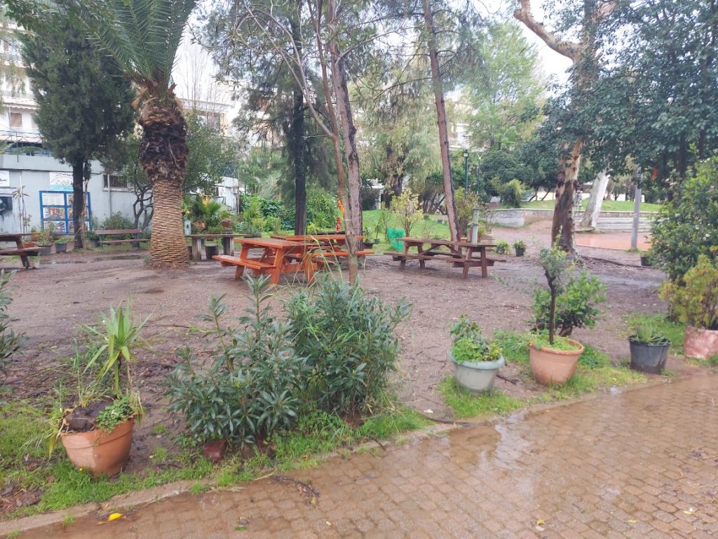 Συνεχίζουμε με τα παγκάκια, που άγνωστο γιατί έχουν δεθεί μεταξύ τους με αλυσίδες, ενώ πρόσφατα προστέθηκε και ένα αυτοσχέδιο. Γύρω δε από αυτά, είναι γλάστρες κάθε είδους, πολλές σε κακή κατάσταση.