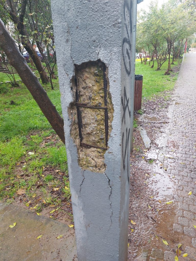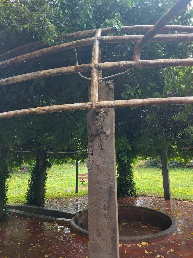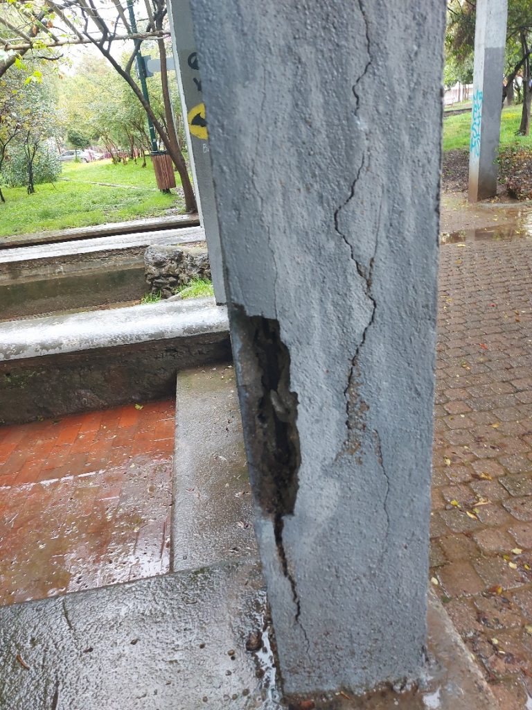 Βέβαια, αυτό είναι το λιγότερο, μπροστά στην κατάσταση στην οποία είναι οι κολώνες της πέργκολας, με τον οπλισμό σε πολλά σημεία να έχει βγει στην επιφάνεια, ενώ η πέργκολα έχει χρόνια να συντηρηθεί.