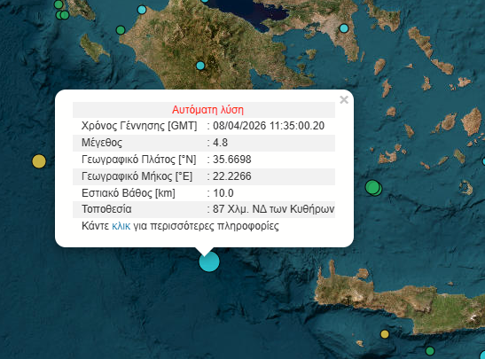 Σύμφωνα με τα πρώτα στοιχεία του Γεωδυναμικού, ήταν μεγέθους 4,8 ρίχτερ με επίκεντρο 87χλμ νδ των Κυθήρων.