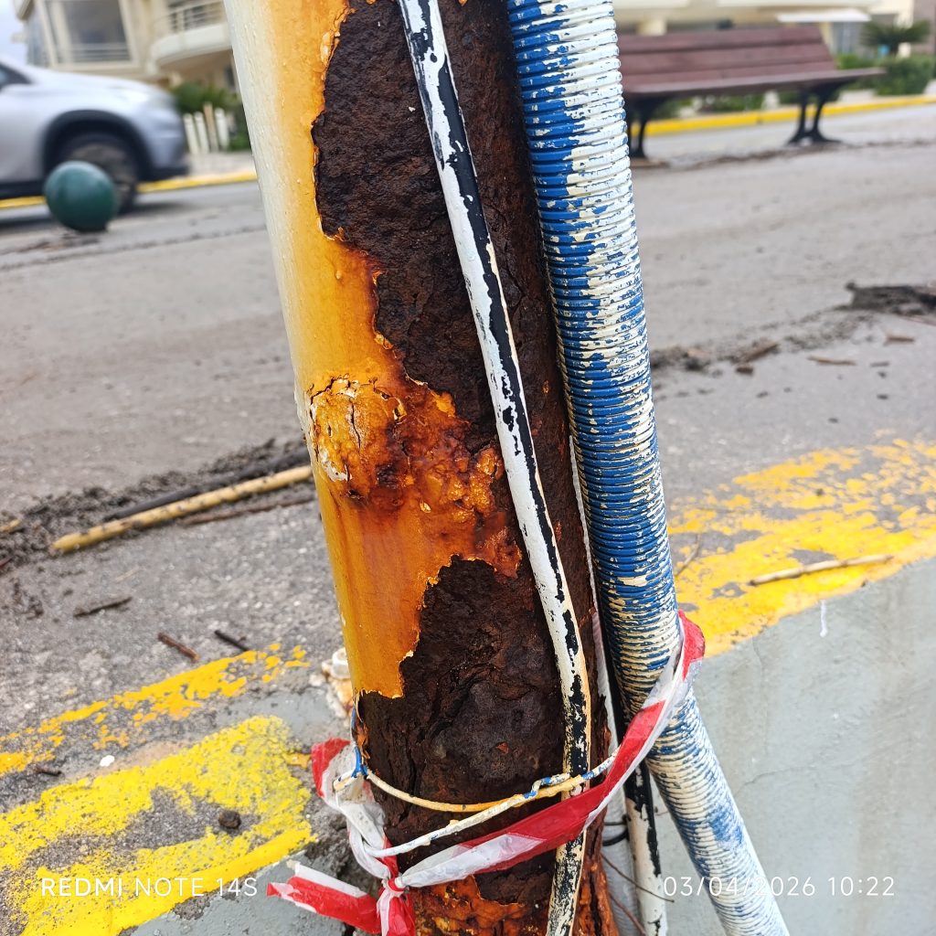 Σύμφωνα με τις φωτογραφίες και τις επισημάνσεις που μας έκανε ο σύμβουλος της κοινότητας Καλαμάτας Διονύσης Αγάλος, η συγκεκριμένη κολώνα έχει υποστεί στη βάση της προχωρημένη οξείδωση, με αποτέλεσμα να υπάρχει κίνδυνος για την ασφάλεια των πολιτών από ενδεχόμενη πτώση της.