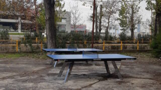 Δύο τραπέζια για πινγκ πονγκ εξωτερικού χώρου έχουν τοποθετηθεί κοντά στα γήπεδάκια τένις και μπάσκετ, χαμηλά στην οδό...