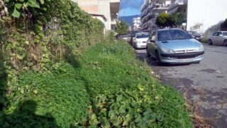 Μην ψάχνετε να βρείτε το πεζοδρόμιο, έχει εξαφανισθεί, κάτω από τα χορτάρια. Πλάτωνος και Μαιζώνος, δεν υπάρχει χώρος...