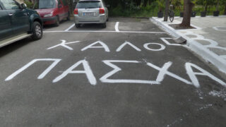 Παραδοσιακά στις γειτονιές της Καλαμάτας ακόμα οι κάτοικοι ασπρίζουν τα πεζοδρόμιά τους και γράφουν στην άσφαλτο τις ευχές...